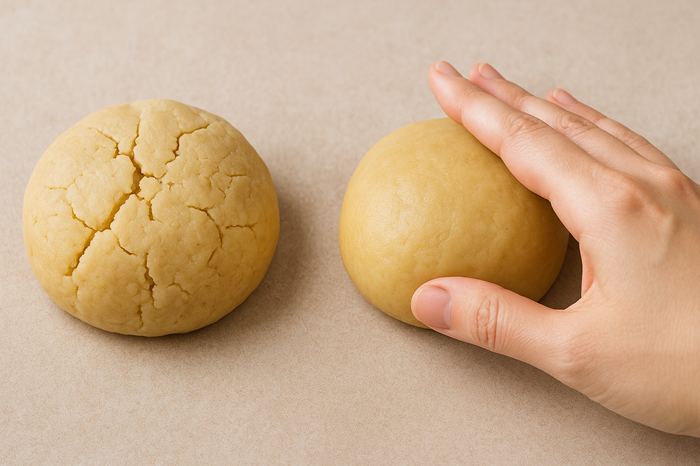 生地を成形する前には、手でそっと触って「ひび割れがないか」「まとまりが良いか」を確認してみましょう。