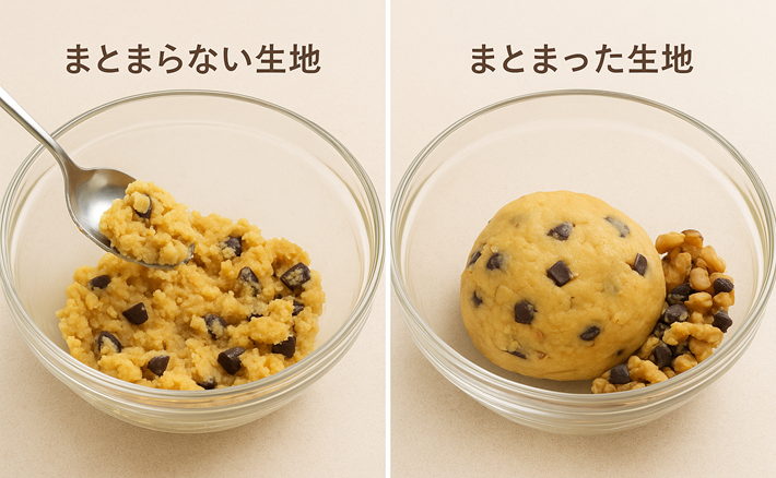 ナッツやチョコチップなどの具材を加えるときは、生地のまとまりや柔らかさに影響が出ることがあります。