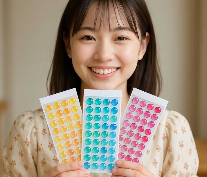 さらに、同系色のシールを並べてグラデーションを作ったり、大粒と小粒を混ぜてリズム感を出したりと、簡単なのにレベルの高い仕上がりを目指せます。