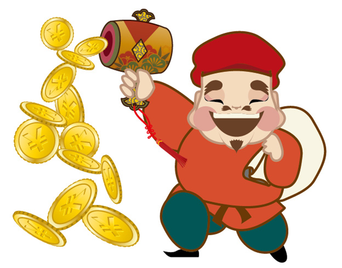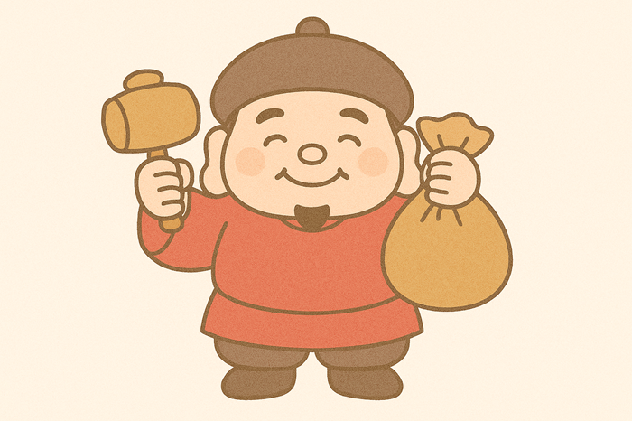 大きな袋と小づちを持っている姿でえがかれることが多く、食べものやお金など、毎日の暮らしを守ってくれます。
