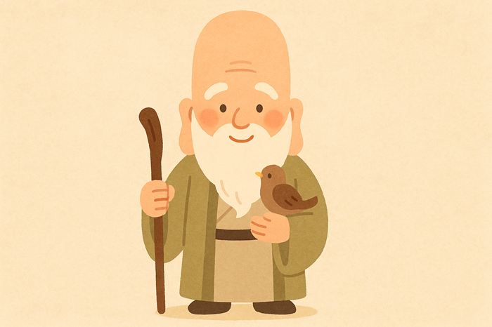 つえを持った姿でえがかれることが多く、「人生をゆっくり、しっかり歩く」ことの大切さを教えてくれます。