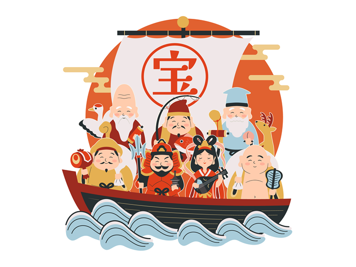 七福神がいっしょに船に乗っているのは、たくさんの福をまとめて人々のもとへ届ける、という意味がこめられています。