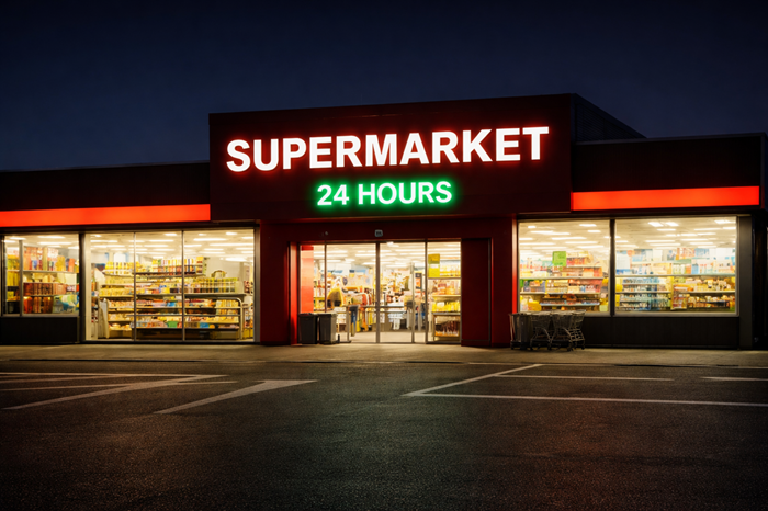 - 24時間営業のスーパーの店内にある